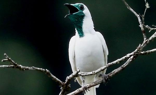 巴拉圭國(guó)鳥(niǎo),雄鳥(niǎo)的羽毛呈雪白色,有光澤。裸眼,喉嚨和下頸部沒(méi)有羽毛,呈亮藍(lán)色。鳥(niǎo)喙適中而偏垂,先端具鉤。腿較短,尾中等,方形。雄鳥(niǎo)為了吸引雌鳥(niǎo)交配,會(huì)發(fā)出像錘子敲鐘的聲音,因此得名。