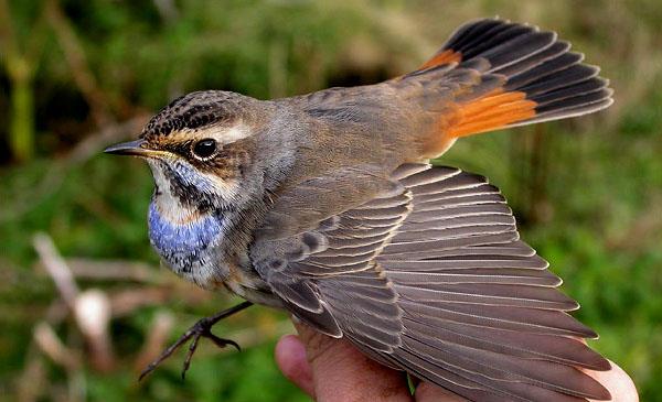 雌鳥酷似雄鳥,但頦部、喉部為棕白色,喉部無栗色塊斑,喉白而無橘黃色及藍色,黑色的細頰紋與由黑色點斑組成的胸帶相連。與雌性紅喉歌鴝及黑胸歌鴝的區(qū)別在尾部的斑紋不同。幼鳥翅上覆羽有淡栗色塊斑和淡色點斑,俗稱“膀點”。