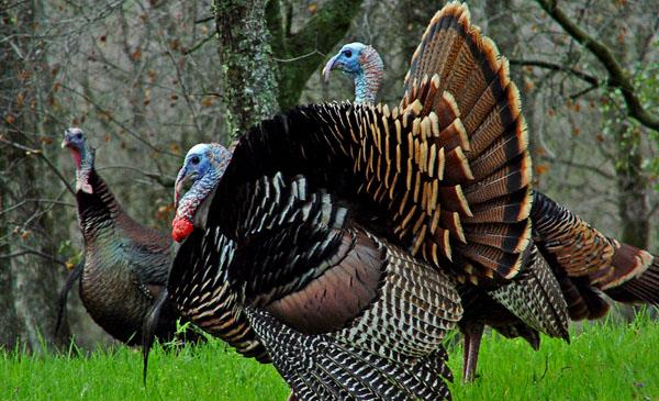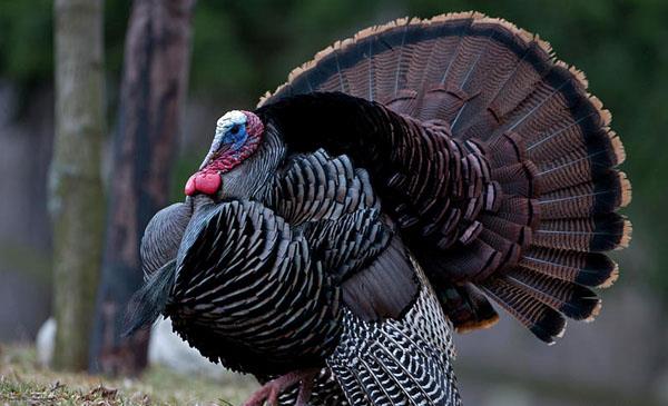 體長(zhǎng)110-115cm。翼展125-144cm,重2.5-11kg。辨識(shí)度極高。嘴強(qiáng)大稍曲。頭頸幾乎裸出,僅有稀疏羽毛,并著生紅色肉瘤,喉下垂有紅色肉瓣。背稍隆起。體羽呈金屬褐色或綠色,散布黑色橫斑。兩翅有白斑,尾羽褐或灰,具斑駁,末端稍圓。腳和趾強(qiáng)大,有兩指,爪甲鋒利,能傷人至死。墨西哥的普通火雞亞種與美國(guó)東南和西南部的普通火雞在羽毛斑點(diǎn)和腰部顏色上稍有差別,但羽衣基本上均為黑色,并帶有虹彩光澤的青銅色和綠色。