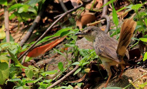雀形目體型較大的留鳥,尾羽較長(zhǎng),羽色褐至暗棕。野生情況下常單獨(dú)或成對(duì)活動(dòng),偶爾亦見成3-5只結(jié)家族群活動(dòng)。性羞怯,藏身于濃密覆蓋下。鳴聲響亮,類似“twee-ee-eet”,短促鳴聲為似喘息的“chirt-chirt”。