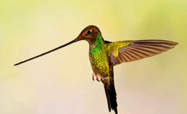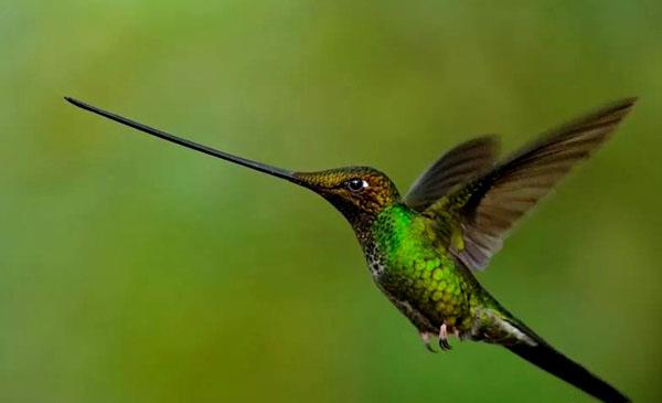 刀嘴蜂鳥:別名劍嘴蜂鳥_劍喙蜂鳥,為雨燕目、蜂鳥科、刀嘴蜂鳥屬鳥類,原產(chǎn)于南美洲安第斯山脈,包括玻利維亞、哥倫比亞、厄瓜多爾、秘魯和委內瑞拉。棲息于海拔高于2500m的密林。飛翔時兩翅急速拍動,快速有力而持久,頻率可達每秒50次以上。1839年命名,無亞種。刀嘴蜂鳥的羽毛細膩、光滑,十分漂亮,同時也具有特殊的反光作用。每當它迎著陽光飛行,即可反射出五彩繽紛的不同色彩,足可以勝過美麗的彩虹。特別是當它進行翻轉動作的時候,因角度不同,而顏色的變幻就更是絢麗多采,因而得到了“飛行的金剛石”的贊譽。