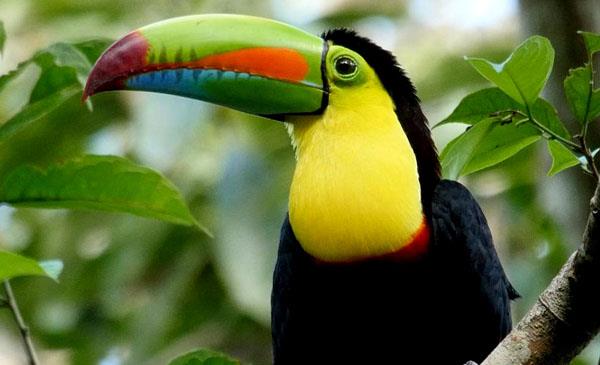 是伯利茲的國鳥,比普通巨嘴鳥略小,外形略似犀鳥,鳥鳴聲嘶啞低沉,類似樹蛙的鳴叫,是中型攀禽。眼睛黑色四周有天藍(lán)色的眼圈,擁有一個(gè)巨大的彩色的喙,上面分布有彩虹一般的漸變花紋,因此得名。