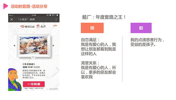 上邊提到的兩個例子,其實都只是利用用戶的某一種心理,令活動得到傳播。而騰訊公益的“‘小朋友’畫廊”活動,卻不單單是利用用戶的心理。我認為騰訊公益的這個活動同時具備陰陽兩面。