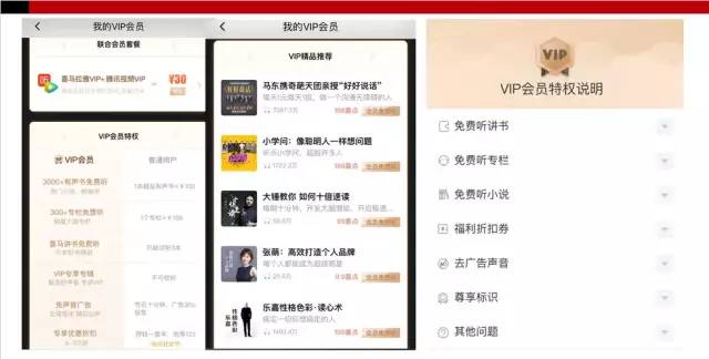 從上圖會員權(quán)益頁面能清晰看到:喜馬拉雅首先將“會員用戶”與“普通用戶”的權(quán)益進(jìn)行了對比,會員用戶享受3000+免費有聲書、300+免費專欄、免費聽講書、還有VIP專享專輯、更能免去音頻廣告、買另收費的課程享有6-9.5折折扣等等權(quán)益,相比于普通用戶的“節(jié)目10分鐘,30s聲音廣告”、“買課無折扣,就等年終123狂歡節(jié)”等捉襟見肘的權(quán)益,會員權(quán)益價值無限被放大。