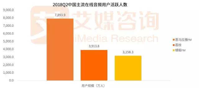 2018年Q2喜馬拉雅活躍用戶數(shù)突破7893萬,大于荔枝和蜻蜓FM的總和,可見喜馬拉雅的活躍用戶規(guī)模在整個在線音頻行業(yè)的占比最大,用戶最為活躍。