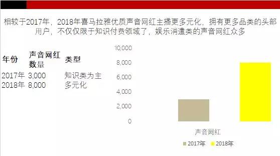 相較于2017年,2018年聲音網(wǎng)紅的增長率達(dá)270%,平臺主要內(nèi)容創(chuàng)業(yè)者的領(lǐng)域也從單一轉(zhuǎn)向多元化發(fā)展。2017年整個行業(yè)都在大談知識付費,2018年開始轉(zhuǎn)向音頻內(nèi)容消費,每條音頻背后的內(nèi)容不再拘泥于可用性、實用性,也可以選擇娛樂性、消遣型的音頻創(chuàng)作。