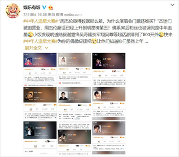 而許多小鮮肉的微博動(dòng)輒就是千萬(wàn)級(jí)甚至過(guò)億的轉(zhuǎn)發(fā),如此巨大的數(shù)據(jù)差異使得讓新一代的粉絲們開(kāi)始看不起所謂的過(guò)氣明星。于是各路周杰倫粉絲網(wǎng)友開(kāi)始下場(chǎng)為自己的偶爾打榜。