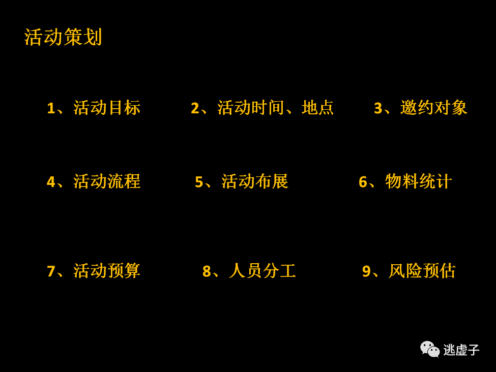 對(duì)于活動(dòng)策劃公司來說,在這樣的模板之下,如果再增加一些創(chuàng)意,那么一個(gè)活動(dòng)就會(huì)被認(rèn)為更加完美了。