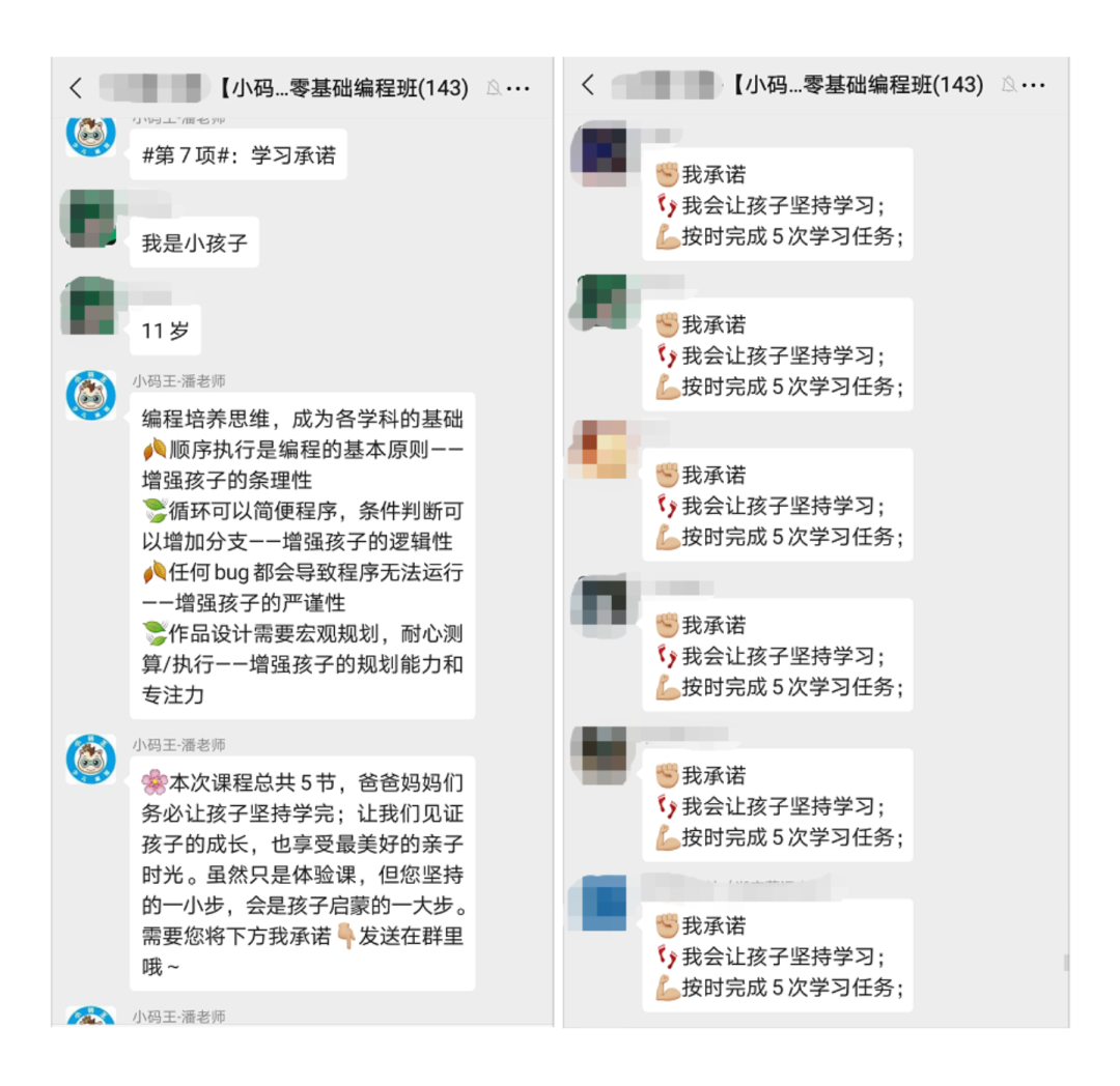 F、學習承諾環(huán)節(jié)設計的很不錯,不僅僅是小碼王對學員的學習承諾,同時也是家長對孩子的學習承諾。通過接龍造勢,為開學典禮的結(jié)尾起到畫龍點睛;讓家長再次自我明確學習目標;潛意識的影響了課程完課率,展現(xiàn)了品牌專業(yè)度。