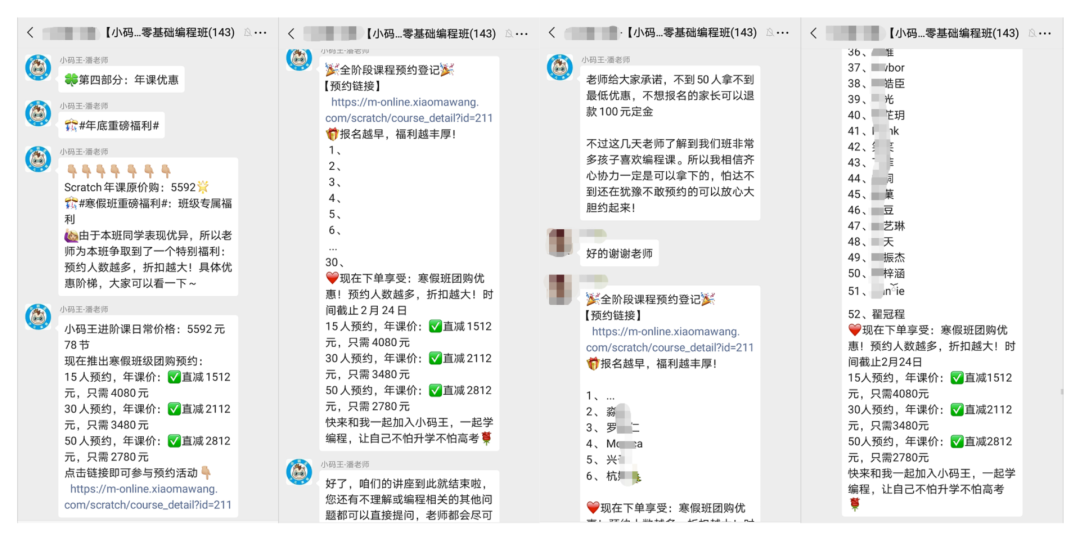 用戶點擊鏈接預付100元押金,然后群內(nèi)接龍的方式進行課程預約登記。這里想著重說的是后種預約登記方式,前者是大家的常規(guī)手段;但是群內(nèi)接龍進行預約登記的可操作性強,而且易形成刷屏效果,通過高頻次的接龍播報。不斷刺激家長,在高頻次的刺激下,加以社群從眾效應,用戶參與預售的可能性能翻倍。