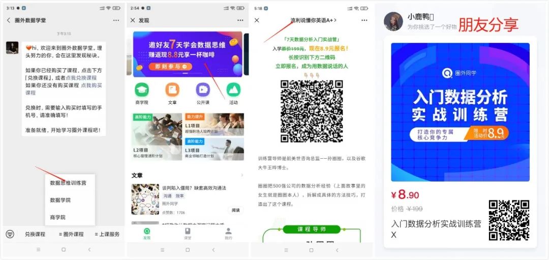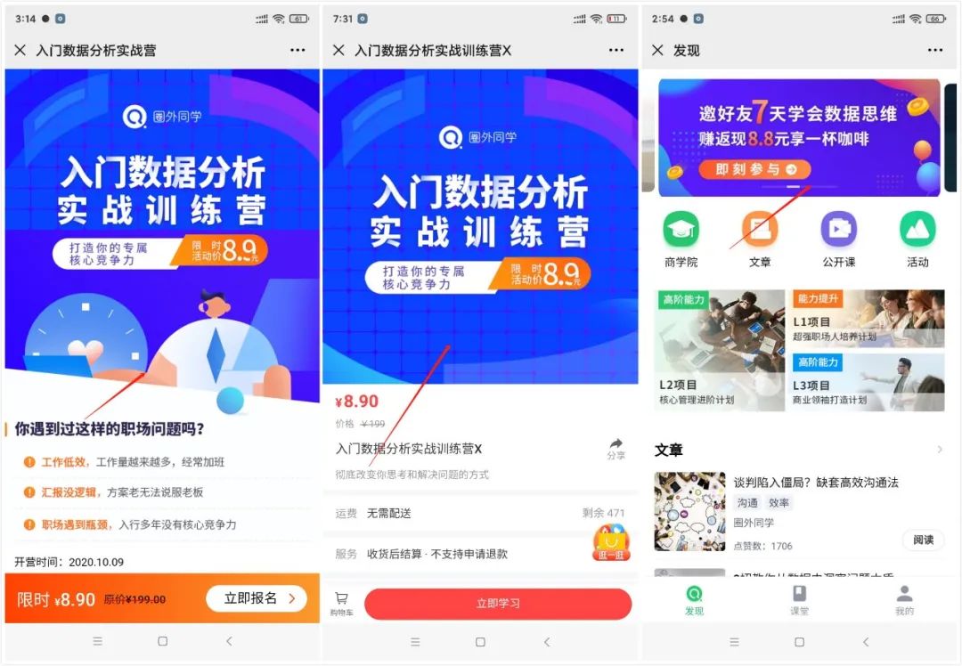 這個低價課程并不是所有的圈外公眾號都有曝光,有一半的公眾號是沒有顯示這個課程。大概是怕出現(xiàn)免費課程和低價課都報了之后,兩個不能同時開課,免費課程和低價課程的在公眾號的分布有點亂。