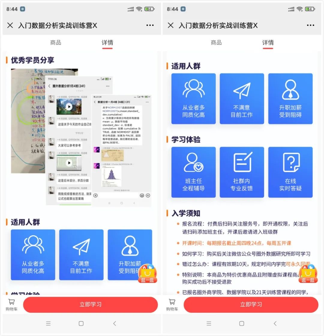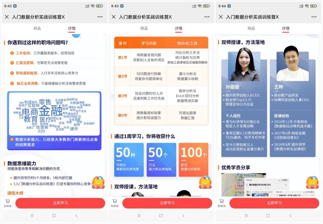 詳情里面給足了充分的動機,通過描述職場場景,說明數(shù)據(jù)分析重要性這一問題,引起用戶的恐懼直擊痛點,然后給出解決辦法-學數(shù)據(jù)分析課程,讓用戶內心充滿希望,想象自己學習這個課程之后可以脫胎換骨。最后進行數(shù)字化的總結:通過一周的學習,你將收獲50種可視化模板,50個行業(yè)和業(yè)務指標,100個職位數(shù)據(jù)分析框架,這個還是蠻吸引人的,用數(shù)據(jù)給予用戶直觀感受。不過詳情頁的主屏就顯得有些單調,如果這里的數(shù)據(jù)換到主屏應該會更吸引人。