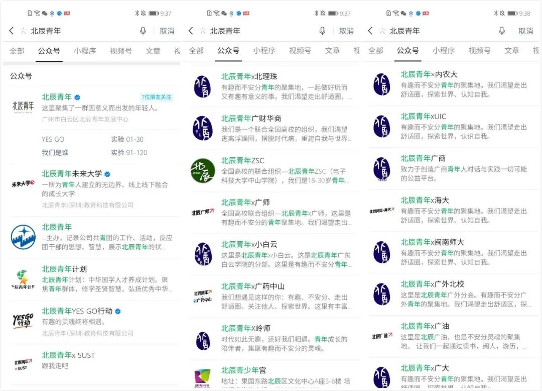 北辰青年主要是全國各地的青年,以及在各大高校的學生,涉及的范圍很廣,目前的公眾號也是50+以上,覆蓋了全國的高校。