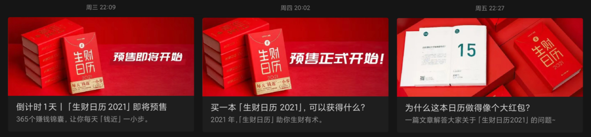 ①注意 通過9月23日的推文做了《生財日歷》預(yù)售倒計時的預(yù)告,全文非常簡單,通過醒目的大紅色日歷海報和“365個賺錢錦囊”“每天[錢進]一小步”成功勾起用戶的好奇心。
