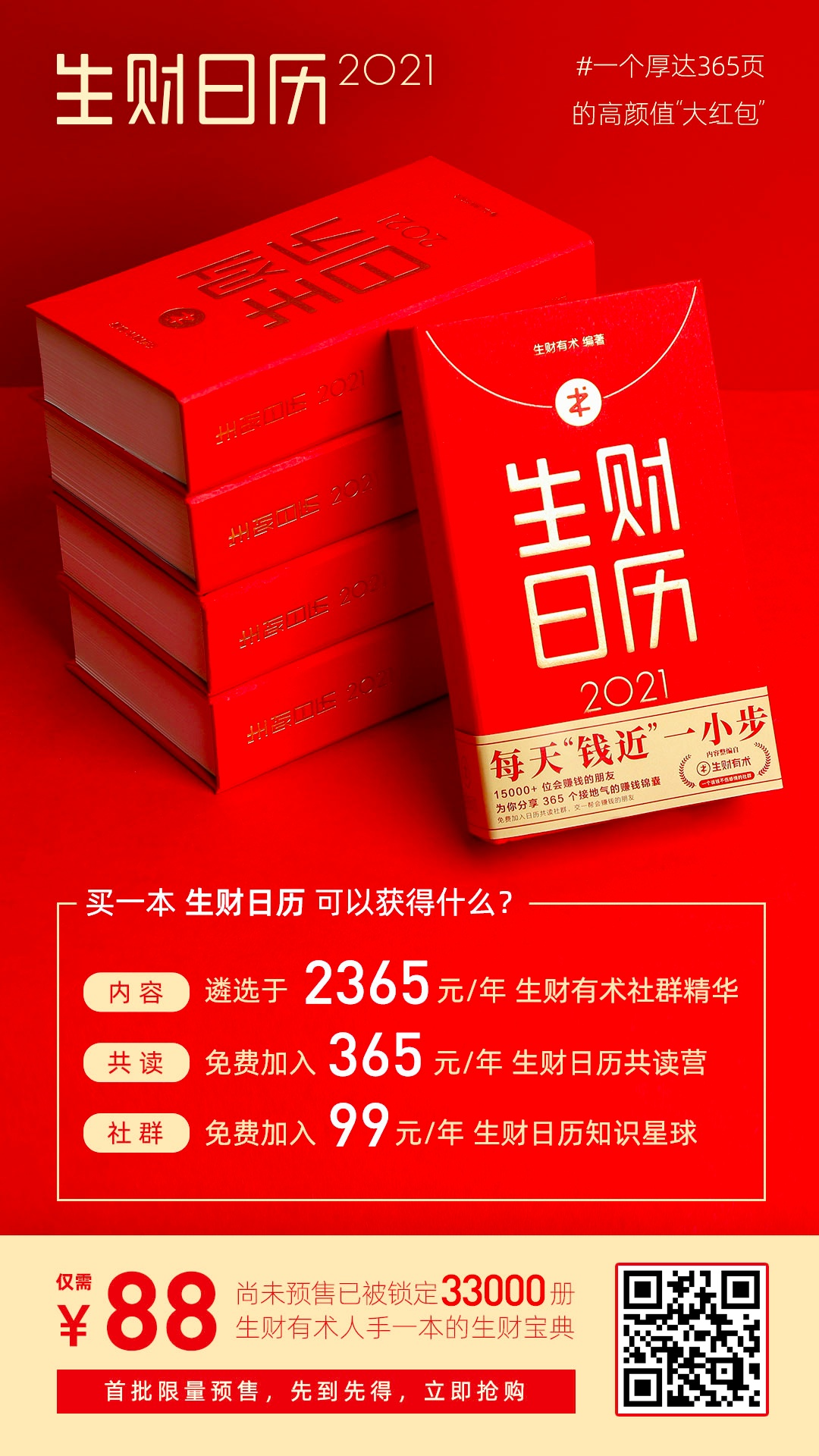 1)左上角標(biāo)題生財日歷2021,右上角注明#一個厚達365頁的高顏值“大紅包”;