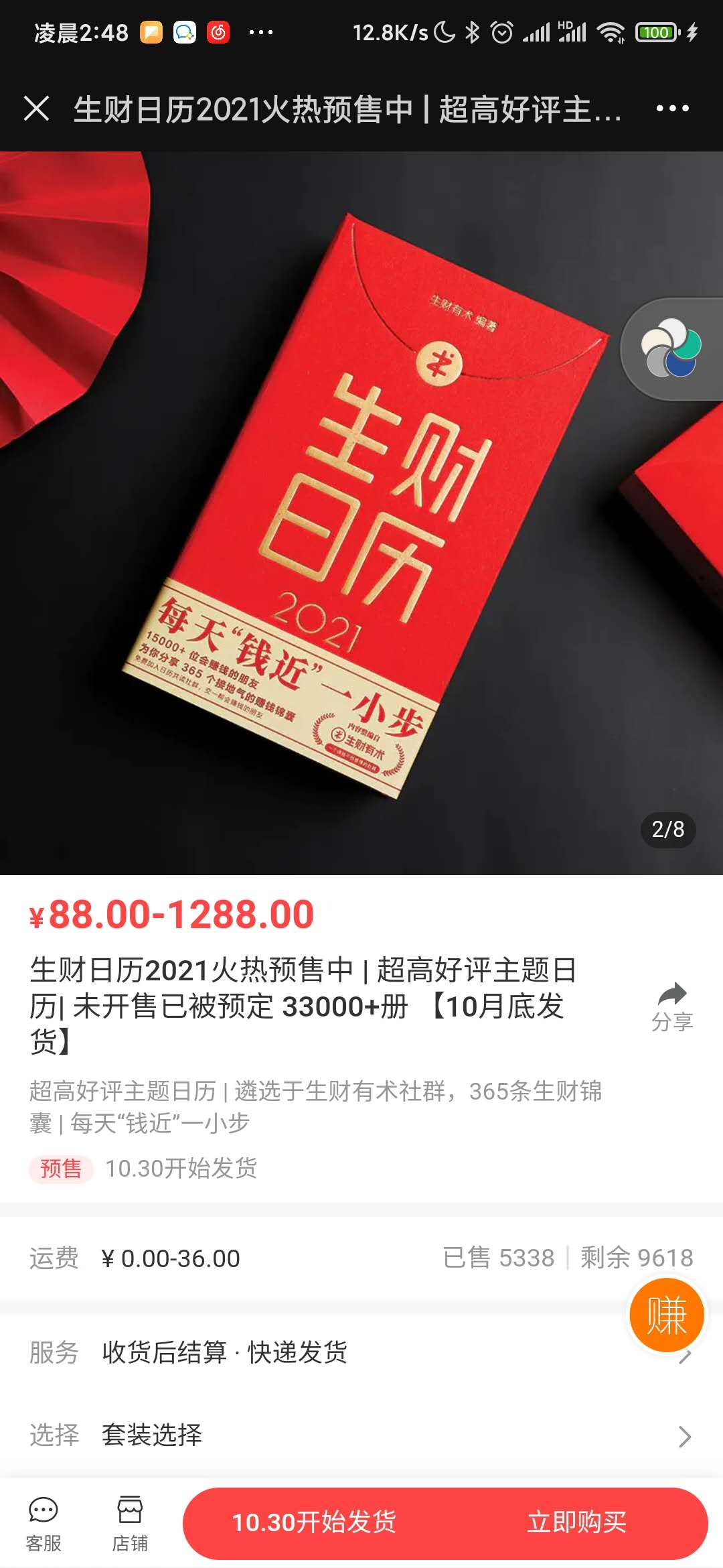 從數(shù)據(jù)上來看,(9月27日02:00)目前生財日歷共售賣出5333份,以均價73.6每本計算,共收入392,508.8元。同時商城還推出了一個“生財日歷2021聯(lián)合發(fā)起人招募計劃”,針對購買100本以上的大客戶,目前共售出252份,每份6160元,共收入1,552,320元;整個商城目前為止共收入194.4萬元。