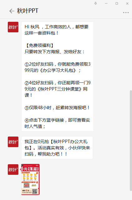 能力這一環(huán),在這場裂變活動中,由于門檻設置的非常低,還幫用戶準備了分享的話術,因此對于用戶的能力要求也很低,只需要復制粘貼將話術+海報分享出去就可以了,因此用戶具備了充足的行動能力。
