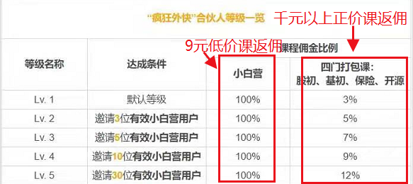 從傭金表可知,獎勵是階梯式的。邀請新用戶越多,高價課的傭金比例越高。