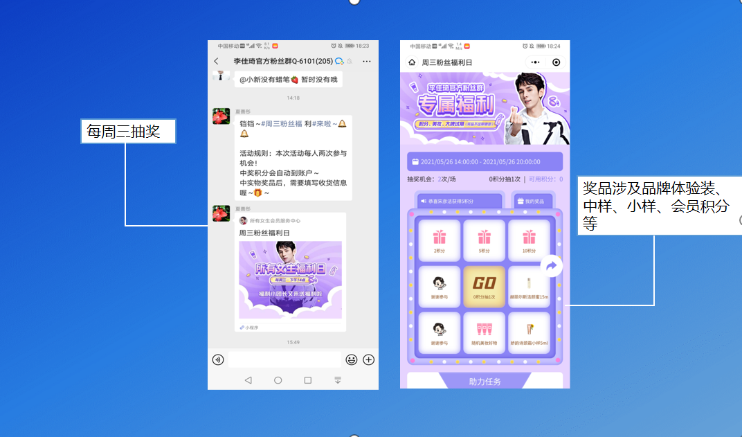 新進群粉絲可免費獲得抽獎機會一次,獎品包括價值千元的護膚禮盒、品牌試用裝、中樣、小樣等;除此之外,每周三群內(nèi)設置抽獎福利,群成員均可參與;通過群福利的塑造,以及大牌獎品深度綁定粉絲,打造專屬自己的魚塘;