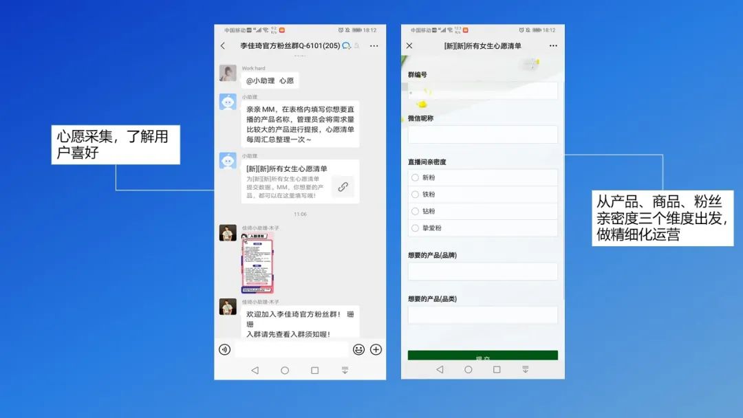作為以女性用戶為主要購買力的直播間,李佳琦專屬社群將精細化運營做到極致,一切以用戶為中心。群內(nèi)設置所有女生心愿清單問卷,618大促期間,填寫你想買的產(chǎn)品品牌、品類,根據(jù)粉絲心愿熱度,提報和上架直播間;