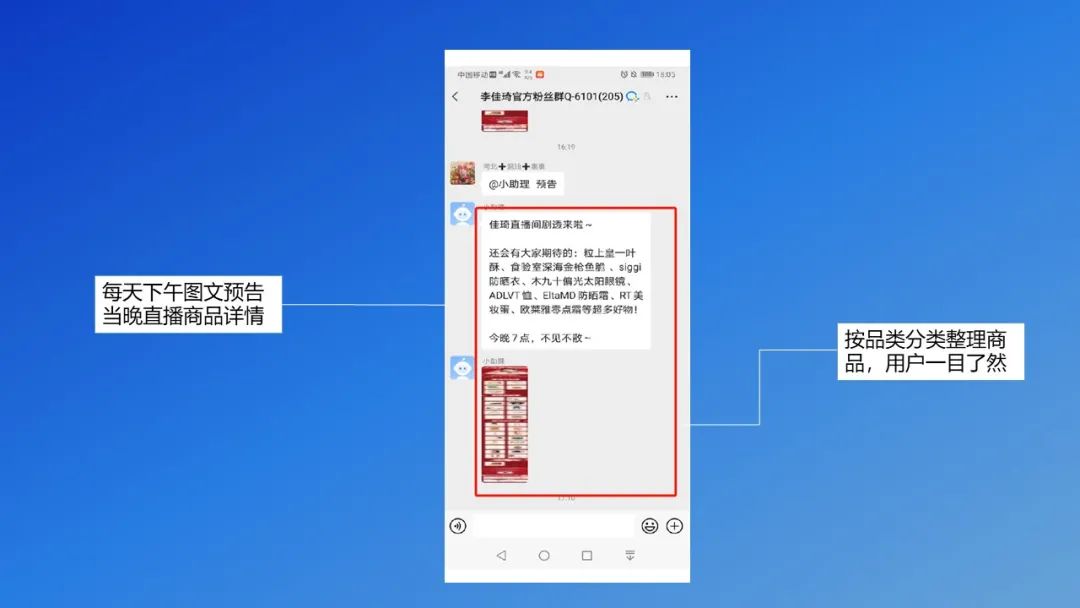 618大促期間,社群輪播直播商品預告。每天下午4點,群機器人推送圖+文形式預告,提前吸引種子用戶關注,為晚上的直播間蓄流量、做轉化;