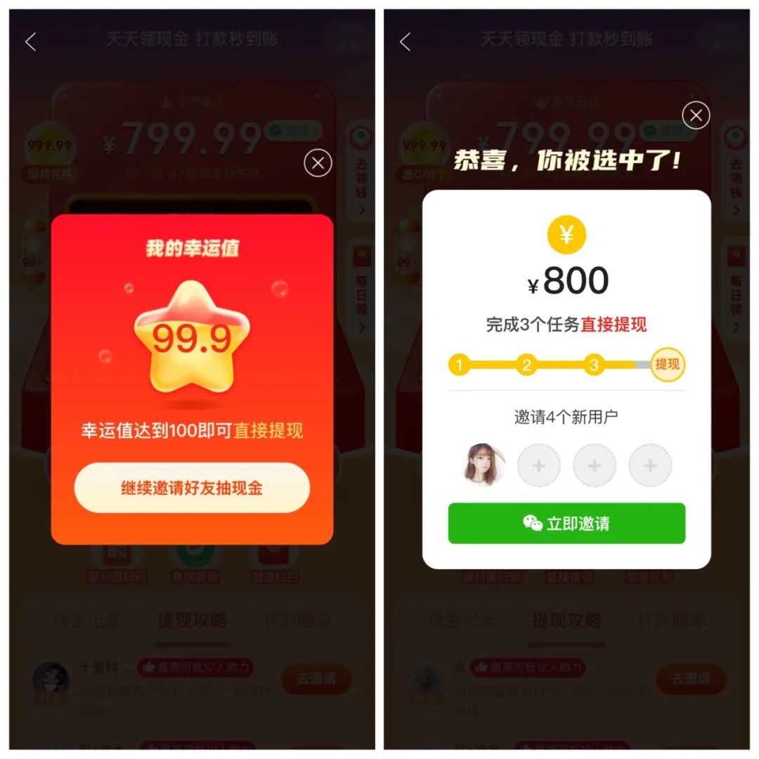 比如用戶退出的時候有挽回放棄的提醒,有紅包失效倒計時的提醒,有無限接近成功的0.01分暗示,有好友已經(jīng)成功提現(xiàn)的誘惑。