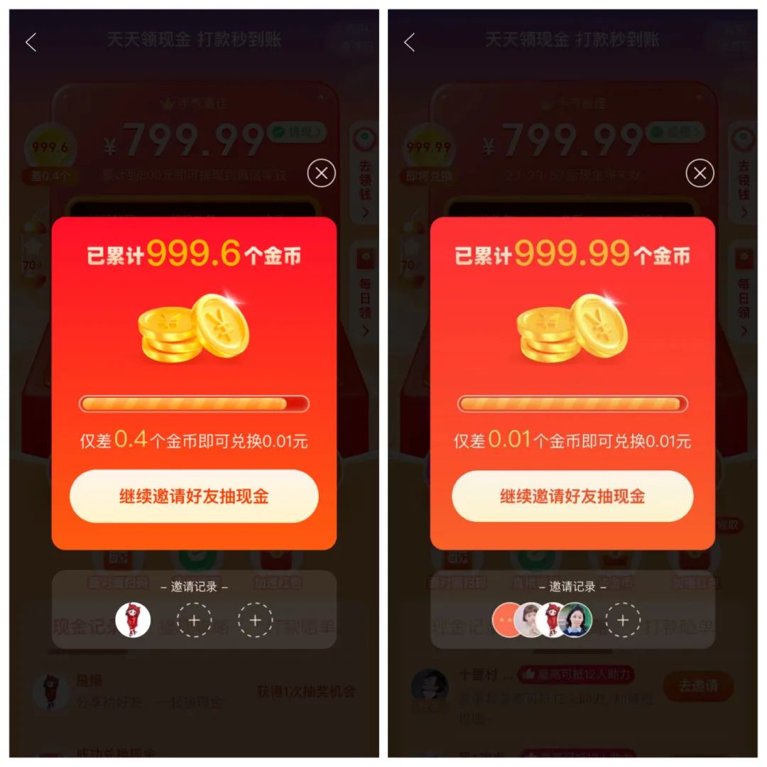 套路二金幣助力:等你籌集到799.99的時候,只有1000金幣才能兌換0.01元。所以官方會先讓你很容易獲得999.1的金幣,每邀請一個好友助力獲得0.1個金幣。