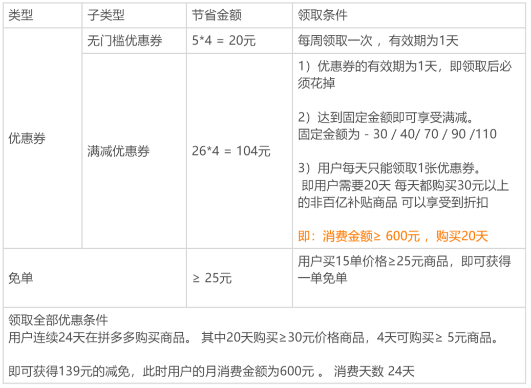 1)吸引用戶的最主要原因是月卡設(shè)置了足夠吸引人的價(jià)格優(yōu)惠,給用戶提供了補(bǔ)貼。讓用戶在拼多多停留更長(zhǎng)時(shí)間,并在這里完成了多次的消費(fèi)。