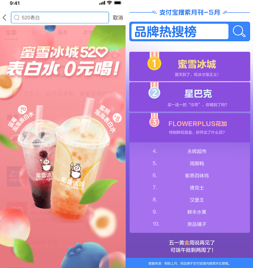 再比如,蜜雪冰城,抓住520等營(yíng)銷節(jié)點(diǎn),打通線上玩法(通過支付寶搜索發(fā)放優(yōu)惠券和0元表白水抽獎(jiǎng))和線下活動(dòng)(新品、店慶),帶動(dòng)蜜雪冰城以超過400%的增幅,登頂支付寶的5月搜索品牌榜。