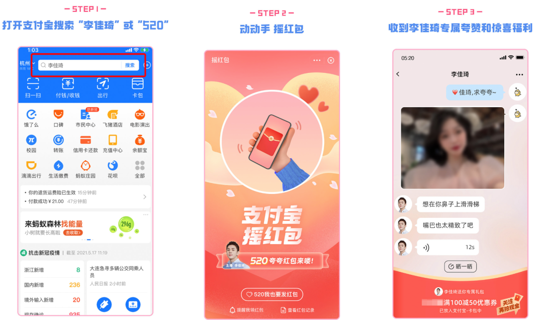 用戶打開支付寶搜索關(guān)鍵詞「李佳琦」,動(dòng)手“搖紅包”,即可收獲李佳琦送出的專屬夸贊和驚喜福利。