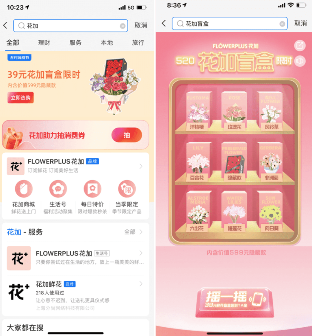 比如鮮花到家品牌花加,通過「搜索關(guān)鍵詞+盲盒」的新玩法,幫其支付寶小程序拉新增長(zhǎng)近20倍,訂單量提升13倍。