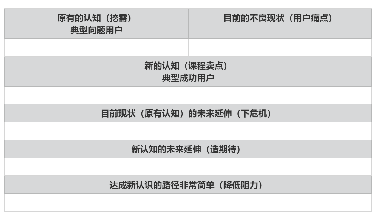 課程賣(mài)點(diǎn)一定要能回扣為什么要學(xué)這門(mén)課程,要能夠解決因?yàn)檎J(rèn)知失衡衍生出來(lái)的問(wèn)題,并滿(mǎn)足新認(rèn)知給用戶(hù)帶來(lái)的期待。實(shí)際操作過(guò)程中如果前期對(duì)用戶(hù)定位不清晰,沒(méi)有精準(zhǔn)的用戶(hù)畫(huà)像,可以嘗試去通過(guò)課程大綱提煉課程賣(mài)點(diǎn)然后去反推解決了用戶(hù)哪些問(wèn)題,反推我需要去找那一類(lèi)用戶(hù)