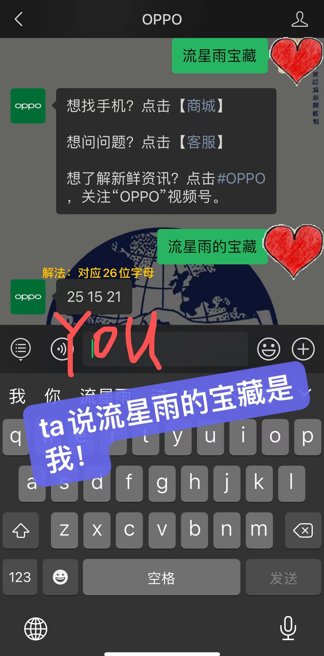 在官微后臺(tái)回復(fù)“流星雨的寶藏”,后臺(tái)就會(huì)給出三個(gè)數(shù)字,對(duì)應(yīng)26位字母順位,拼出來(lái)就是“YOU”。流星雨的寶藏就是你,猜中的同時(shí)是不是還有點(diǎn)小浪漫?