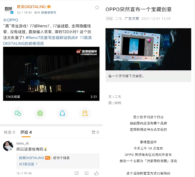 最后,作為一場(chǎng)跨平臺(tái)整合營(yíng)銷活動(dòng),OPPO發(fā)起的這場(chǎng)「流星雨寶藏解謎挑戰(zhàn)」以“流星雨”為線索串聯(lián)起了微博、微信、淘寶等各官方平臺(tái)以及各領(lǐng)域KOL,并將本輪Reno7新品上市的各階段和各渠道的素材、內(nèi)容也加入進(jìn)來(lái),實(shí)現(xiàn)了資源最大化利用,在促進(jìn)品牌曝光的同時(shí)也為平臺(tái)引流,可以說(shuō)是一次品牌新品營(yíng)銷創(chuàng)新之舉。