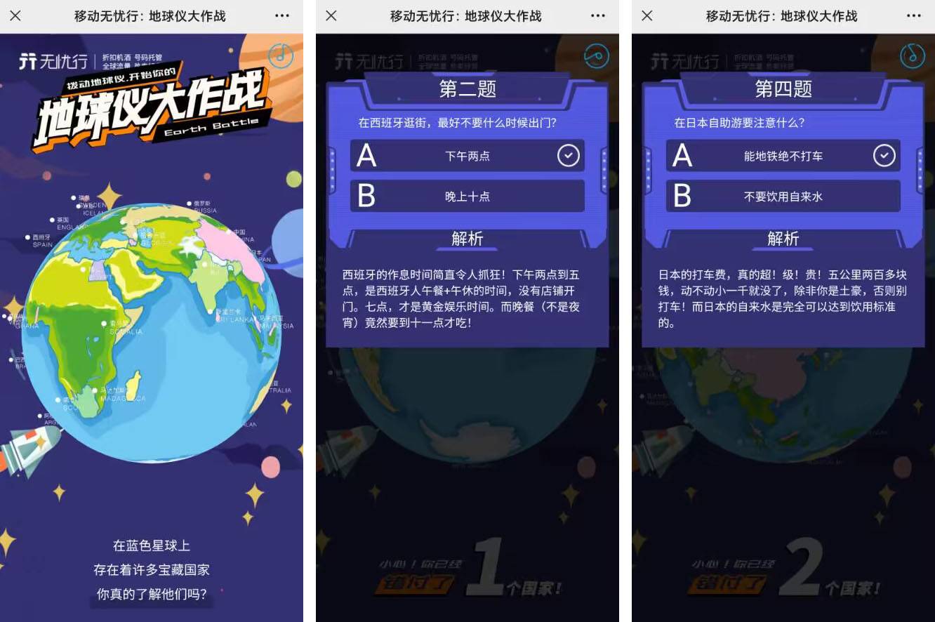 項目亮點:這是由中國移動無憂行旅行服務平臺推出的品牌宣傳活動,邀請用戶參與境外出行知識競賽,實現(xiàn)品牌曝光和業(yè)務推介信息。進入H5活動后,H5會展現(xiàn)給用戶一個手繪建模的地球儀,每個國家的地圖輪廓就是一個答題按鈕,共30個。玩家可以自由撥動地球儀,點擊按鈕,即可觸發(fā)問題。問題是選擇題,由玩家二選一。答錯5道題后,彈出分享求復活頁面,分享后獲得復活機會;再答錯5道題,就會彈出結果頁。在錯題機會用盡之前,答完全部30道題,也會彈出結果頁。 為了方便玩家查找未回答問題,每回答完一個問題,此國家的名字就會在地球儀上消失。