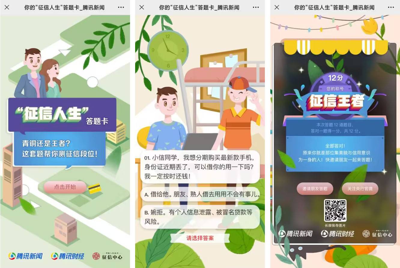 項目亮點:這是由騰訊財經聯(lián)合征信中心推出的知識競賽H5活動,通過答題的形式讓用戶學習到征信相關的一些基本常識。H5以選擇題的形式進行知識競賽,總共有十二道題,每一道題都是與征信相關的內容,并搭配有相關場景的背景圖,提升用戶對相關知識的理解,讓用戶知道征信的重要性。用戶答題后可以立即知曉答題結果,未答題時顯示白色框框,選擇后變成粉色框框,點擊確定后會提示是否正確,如果答對了會給出一種開心的提示音,答錯了變成哭泣的提示音并給出正確答案,然后進入下一題。12道題結束之后生成成績海報,結算答題分數,根據分數劃分用戶的分段,并邀請用戶分享自己的征信小故事,引導用戶關注官徽公眾號和邀請朋友來答題。