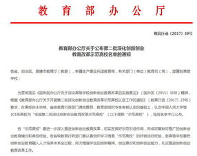 各省、自治區(qū)、直轄市教育廳(教委),新疆生產(chǎn)建設(shè)兵團教育局: 為貫徹落實《國務(wù)院辦公廳關(guān)于深化高等學校創(chuàng)新創(chuàng)業(yè)教育改革的實施意見》(國辦發(fā)〔2015〕36號)精神,教育部決定開展認定第二批深化創(chuàng)新創(chuàng)業(yè)教育改革示范高校工作。
