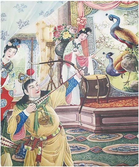 射的人超過幾十人,都不合要求,唐高祖李淵最后射兩箭射中孔雀的兩只眼睛,于是就把竇后嫁給了高祖。后來高祖真的當(dāng)上皇帝,竇后做了皇后。