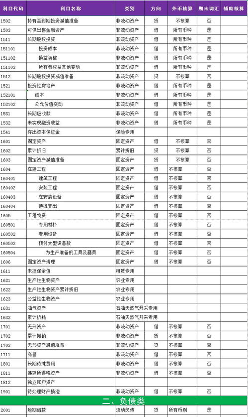 一、資產(chǎn)類 1001庫存現(xiàn)金 1002銀行存款 1003存放中央銀行款項(xiàng) 1011存放同業(yè) 1012其他貨幣資金 1021結(jié)算備付金 1031存出保證金 1101交易性金融資產(chǎn) 1111買入返售金融資產(chǎn) 1121應(yīng)收票據(jù) 1122應(yīng)收賬款 1123預(yù)付賬款 1131應(yīng)收股利 1132應(yīng)收利息 1201應(yīng)收代位追償款 1211應(yīng)收分保賬款 1212應(yīng)收分保合同準(zhǔn)備金 1221其他應(yīng)收款 1231壞賬準(zhǔn)備 1301貼現(xiàn)資產(chǎn) 1302拆出資金 1303貸款 1304貸款損失準(zhǔn)備 1311代理兌付證券 1321代理業(yè)務(wù)資產(chǎn) 1401材料采購 1402在途物資 1403原材料 1404材料成本差異 1405庫存商品 1406發(fā)出商品 1407商品進(jìn)銷差價(jià) 1408委托加工物資 1411周轉(zhuǎn)材料 1421消耗性生物資產(chǎn) 1431貴金屬 1441抵債資產(chǎn) 1451損余物資 1461融資租賃資產(chǎn) 1471存貨跌價(jià)準(zhǔn)備 1501持有至到期投資 1502持有至到期投資減值準(zhǔn)備 1503可供出售金融資產(chǎn) 1511長期股權(quán)投資 1512長期股權(quán)投資減值準(zhǔn)備 1521投資性房地產(chǎn) 1531長期應(yīng)收款 1532未實(shí)現(xiàn)融資收益 1541存出資本保證金 1601固定資產(chǎn) 1602累計(jì)折舊 1603固定資產(chǎn)減值準(zhǔn)備 1604在建工程 1605工程物資 1606固定資產(chǎn)清理 1611未擔(dān)保余值 1621生產(chǎn)性生物資產(chǎn) 1622生產(chǎn)性生物資產(chǎn)累計(jì)折舊 1623公益性生物資產(chǎn) 1631油氣資產(chǎn) 1632累計(jì)折耗 1701無形資產(chǎn) 1702累計(jì)攤銷 1703無形資產(chǎn)減值準(zhǔn)備 1711商譽(yù) 1801長期待攤費(fèi)用 1811遞延所得稅資產(chǎn) 1821獨(dú)立賬戶資產(chǎn) 1901待處理財(cái)產(chǎn)損溢 二、負(fù)債類 2001短期借款 2002存入保證金 2003拆入資金 2004向中央銀行借款 2011吸收存款 2012同業(yè)存放 2021貼現(xiàn)負(fù)債 2101交易性金融負(fù)債 2111賣出回購金融資產(chǎn)款 2201應(yīng)付票據(jù) 2202應(yīng)付賬款 2203預(yù)收賬款 2211應(yīng)付職工薪酬 2221應(yīng)交稅費(fèi) 2231應(yīng)付利息 2232應(yīng)付股利 2241其他應(yīng)付款 2251應(yīng)付保單紅利 2261應(yīng)付分保賬款 2311代理買賣證券款 2312代理承銷證券款 2313代理兌付證券款 2314代理業(yè)務(wù)負(fù)債 2401遞延收益 2501長期借款 2502應(yīng)付債券 2601未到期責(zé)任準(zhǔn)備金 2602保險(xiǎn)責(zé)任準(zhǔn)備金 2611保戶儲金 2621獨(dú)立賬戶負(fù)債 2701長期應(yīng)付款 2702未確認(rèn)融資費(fèi)用 2711專項(xiàng)應(yīng)付款 2801預(yù)計(jì)負(fù)債 2901遞延所得稅負(fù)債 三、共同類 3001清算資金往來 3002貨幣兌換 3101衍生工具 3201套期工具 3202被套期項(xiàng)目 四、所有者權(quán)益類 4001實(shí)收資本 4002資本公積 4101盈余公積 4102一般風(fēng)險(xiǎn)準(zhǔn)備 4103本年利潤 4104利潤分配 4201庫存股 五、成本類 5001生產(chǎn)成本 5101制造費(fèi)用 5201勞務(wù)成本 5301研發(fā)支出 5401工程施工 5402工程結(jié)算 5403機(jī)械作業(yè) 六、損益類 6001主營業(yè)務(wù)收入 6011利息收入 6021手續(xù)費(fèi)及傭金收入 6031保費(fèi)收入 6041租賃收入 6051其他業(yè)務(wù)收入 6061匯兌損益 6101公允價(jià)值變動損益 6111投資收益 6201攤回保險(xiǎn)責(zé)任準(zhǔn)備金 6202攤回賠付支出 6203攤回分保費(fèi)用 6301營業(yè)外收入 6401主營業(yè)務(wù)成本 6402其他業(yè)務(wù)成本 6403營業(yè)稅金及附加 6411利息支出 6421手續(xù)費(fèi)及傭金支出 6501提取未到期責(zé)任準(zhǔn)備金 6502提取保險(xiǎn)責(zé)任準(zhǔn)備金 6511賠付支出 6521保單紅利支出 6531退保金 6541分出保費(fèi) 6542分保費(fèi)用 6601銷售費(fèi)用 6602管理費(fèi)用 6603財(cái)務(wù)費(fèi)用 6604勘探費(fèi)用 6701資產(chǎn)減值損失 6711營業(yè)外支出 6801所得稅費(fèi)用 6901以前年度損益調(diào)整。