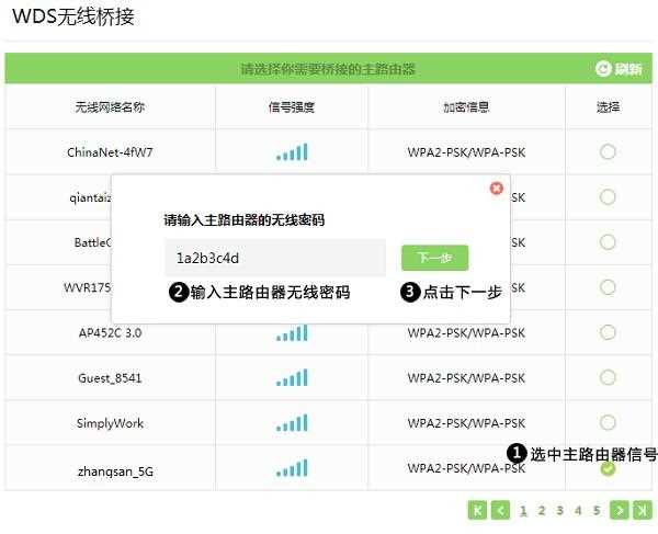 6、路由器會自動掃描出周邊的無線網(wǎng)絡信號,選擇你的主路由器的,輸入主路由器的無線密碼,下一步。