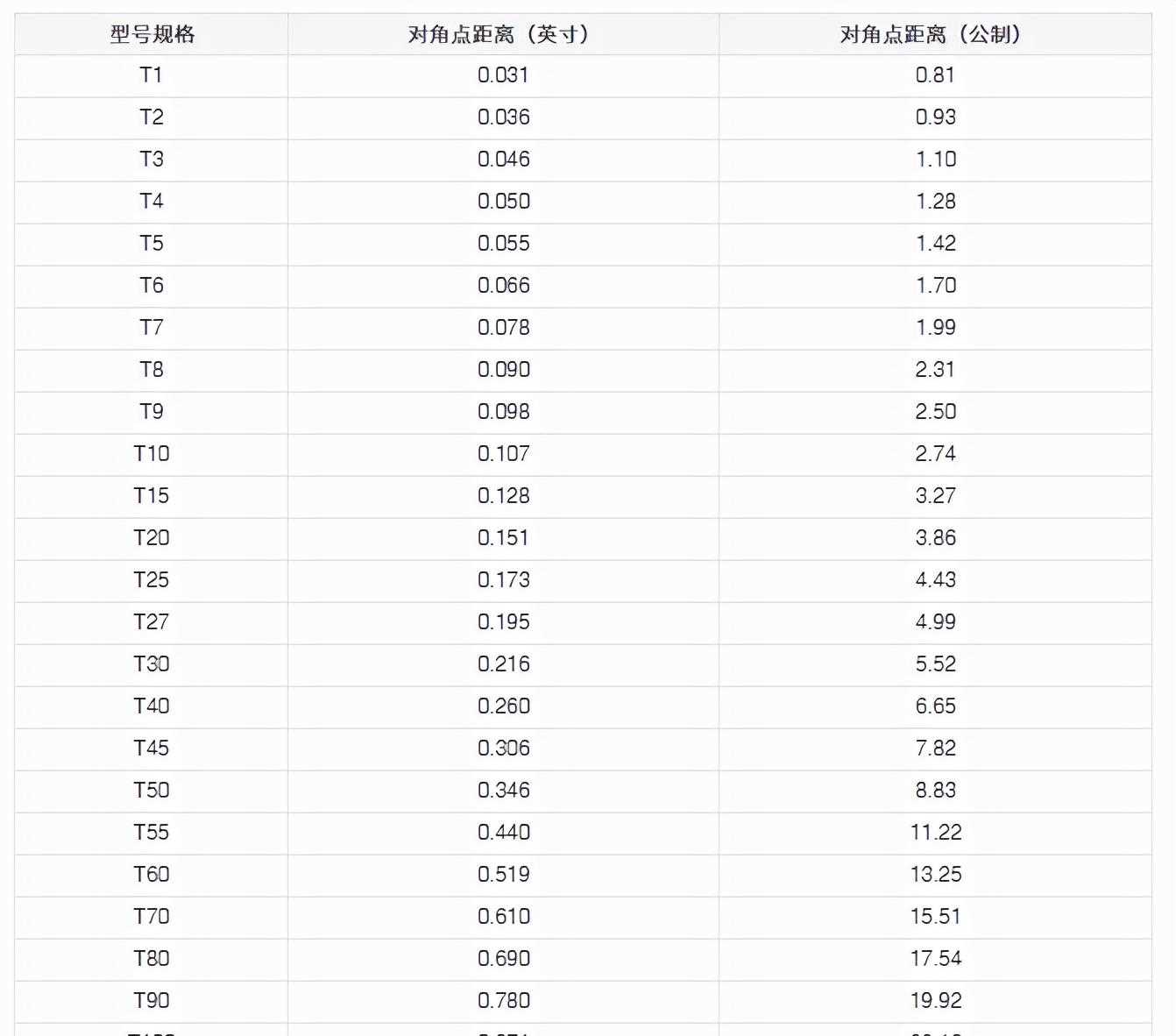 星形螺絲刀的規(guī)格一般用對角的長度表示,通常用T+數(shù)字表示。標(biāo)準(zhǔn)常見的有以下規(guī)格。T1、T2、T3、T4、T5、T6、T7、T8、T9、T10、T15、T20、T25、T27、T30、T40、T45、T50、T55、T60、T70、T80、T90、T100等。規(guī)格和對角長度的對應(yīng)關(guān)系如下圖所示。