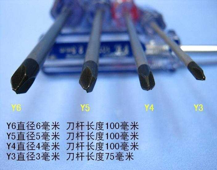 顧名思義,Y形螺絲刀的刀頭槽口形狀像一個字母Y,用來拆卸凹形是Y字形的螺絲。Y形螺絲刀的規(guī)格一般用刀頭直徑表示,通常數(shù)字前帶Y,常用規(guī)格有Y1、Y2、Y3、Y4、Y5、Y6等。