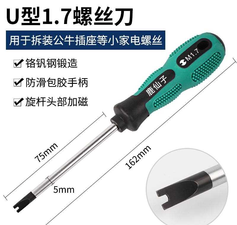 U形螺絲刀的刀頭有2個突出的端口,像一個字母U,它的規(guī)格一般用2個突口的間距表示,常用規(guī)格有U1.7、U2.0、U2.3、U2.6等。U形螺絲刀使用場景也不多,公牛插座上比較常見。