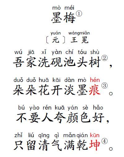 (4)淡墨:水墨畫中將墨色分為幾種,如,淡墨、濃墨、焦墨。這里是說那朵朵盛開的梅花,是用淡淡的墨跡點(diǎn)化成的。