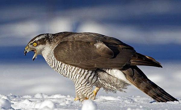 體長(zhǎng)28-38cm,重160-200g。雄鳥整個(gè)頭頂至后頸石板黑色,頭頂綴有棕褐色。眼先白色,頭側(cè)、頸側(cè)和其余上體暗灰褐色。頸項(xiàng)和后頸基部羽毛白色。內(nèi)哃基部白色,具褐色橫斑,尾和尾上覆羽灰褐色。頦和喉白色,具有1條寬闊的黑褐色中央縱紋。胸和兩肋白色,具寬而粗著的灰栗色橫斑。腹白色,具灰褐色橫斑。覆腿羽白色,亦具灰褐色橫斑。尾下覆羽白色,具少許斷裂的暗灰褐色橫斑。虹膜、蠟?zāi)ず湍_黃色,嘴在基部為鉛藍(lán)色,尖端黑色。