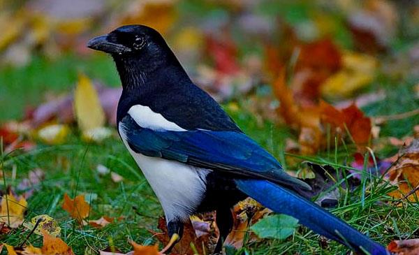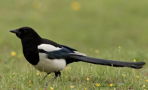 頭體長(zhǎng)40-50cm,頭、頸、背至尾均為黑色,并自前往后分別呈現(xiàn)紫色、綠藍(lán)色、綠色等光澤,雙翅黑色而在翼肩有一大形白斑,尾遠(yuǎn)較翅長(zhǎng),呈楔形,嘴、腿、腳純黑色,腹面以胸為界,前黑后白。虹膜暗褐色;嘴、跗蹠和趾均黑色。雌雄鳥(niǎo)常保持一定距離,在地上活動(dòng)時(shí)則以跳躍式前進(jìn)。鳴聲單調(diào)、響亮,似zha-zha-zha聲,常邊飛邊鳴叫。