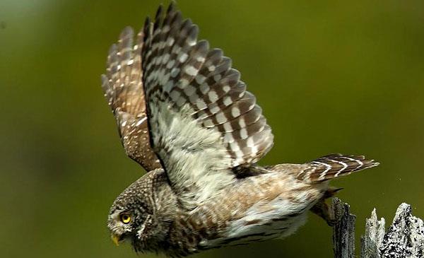 體型雖小,但性情兇猛,嘴、爪強(qiáng)健有力,能獵捕比其自身大得多的獵物。面盤(pán)不顯著,無(wú)耳簇羽。眼先及眉紋白色,眼先羽軸黑色,并延長(zhǎng)成發(fā)須狀。飛行時(shí)上下波狀起伏似啄木鳥(niǎo)。