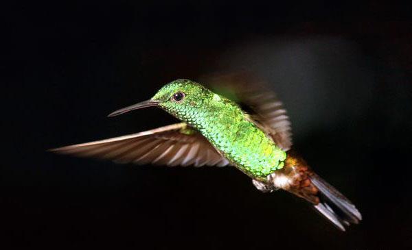 頭體長(zhǎng)6-9cm,重約4.7g。上體前半部銅綠色,腰背部和翼角紅銅色,臀部青銅色,頭部和腹部是鮮艷的綠色,并有金屬光澤,鳥(niǎo)喙細(xì)長(zhǎng)而直,舌伸縮自如。翅形狹長(zhǎng),尾尖,叉形。腳短,趾細(xì)小而弱。鳥(niǎo)喙長(zhǎng)而直,主要是黑色,但在喙基處透露出一些粉紅色。虹膜黑色。為適應(yīng)翅膀的快速拍打,蜂鳥(niǎo)的代謝率是所有動(dòng)物是最快的,它們的心跳能達(dá)到每分鐘500下。