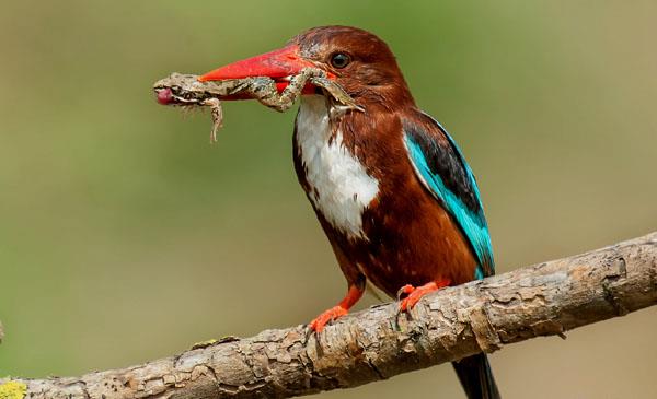 體長26-30cm,重50-100g。嘴赤紅,粗長似鑿,基部較寬,嘴峰直。頭的余部、后頸、頸側(cè)以及下體余部均深赤栗色,兩肋稍淡。成鳥的頦、喉、胸部中央純白。上背、肩及三級飛羽藍(lán)綠色,下背、腰及尾上覆羽均輝翠綠色。尾呈暗藍(lán)色,并具黑褐色羽干。除中央一對外,其余尾羽均內(nèi)緣以暗褐色。腋羽和翼下覆羽淡栗棕色。虹膜暗褐,嘴呈珊瑚紅以至赤紅色,腳和趾均珊瑚紅色。