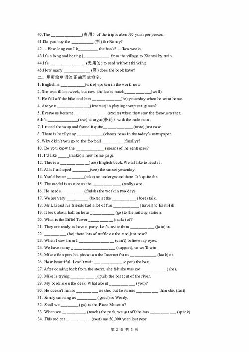 (1)不規(guī)則變化的形容詞和副詞如下: →better→best →wors →worst (許多)many/much→more→most (幾乎沒有)little→less→least (遠(yuǎn)的)far→farther→farthest (老的,舊的)old (2)三種句型 ① 原級句型: as+形容詞/副詞+as,表示“和…一樣”;否定句式:not as/so +形容詞/副詞+as,表示“和…不一樣”。 eg. I think Kate does just as well as Ann. If you like the chicken, you may have as much as you can. I don't like the film. It's not so interesting as that one. ② 比較級句型: a. 主語+謂語+比較級+than+其它,表示“較…一些”。